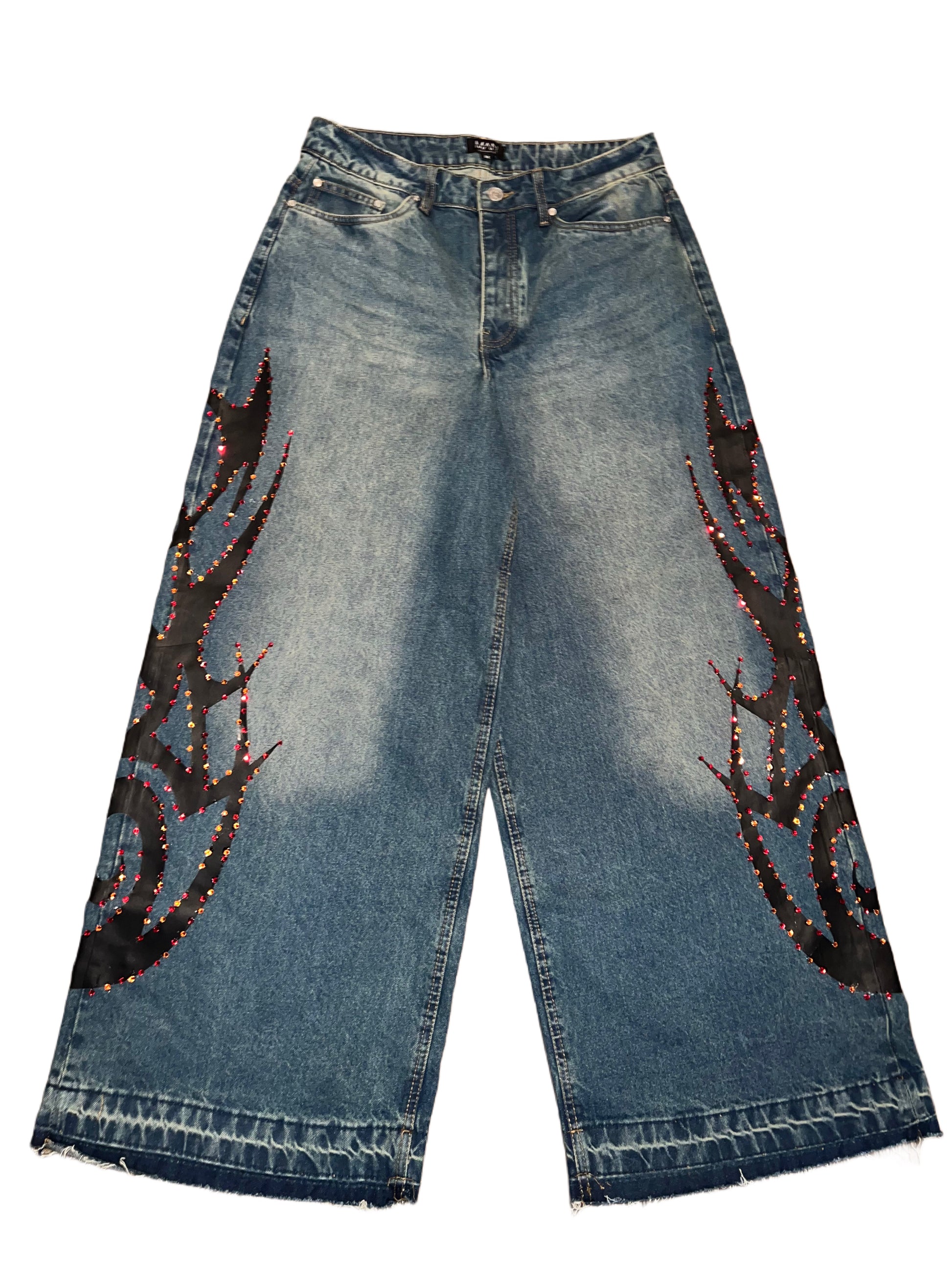 OVERSIZED CUSTOM FLAMED JEANS W/ RHINESTONES